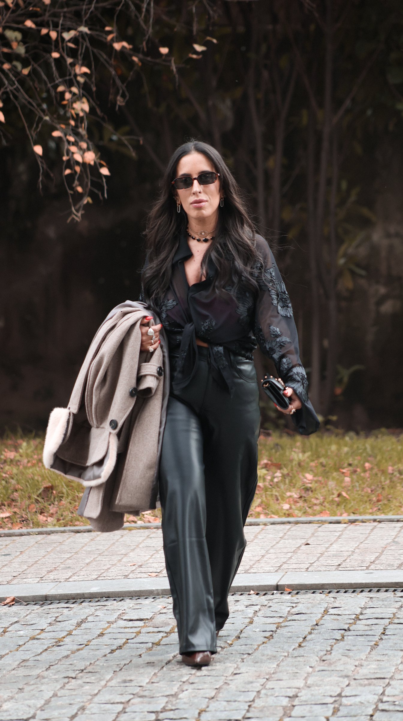 Calça disponível em preto e em castanho.